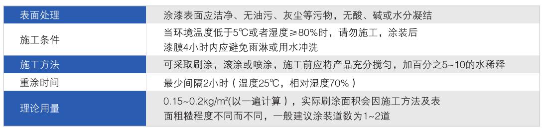 根據(jù)要求選擇配套體系,本產(chǎn)品可與大多數(shù)水性底漆和溶劑型漆配套使用,配套前應進行必要的測試評價。